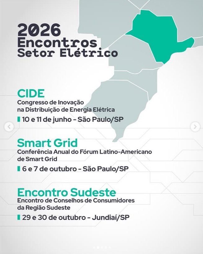 Além dos eventos já citados, o calendário traz ainda informações sobre o CIDE- Congresso de Inovação na Distribuição de Energia Elétrica, nos dias 10 e 11 de junho, em São Paulo-SP e o Smart Grid- Conferência Anual do Fórum Latino-Americano de Smart Grid, dias 6 e 7 de outubro, também em São Paulo-SP.