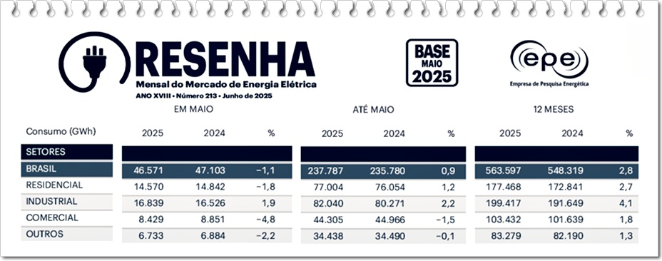 O consumo de eletricidade no Brasil registrou queda de -1,1% em maio de 2025, comparado ao mesmo mês do ano passado. É o que aponta a Resenha Mensal do Mercado de Energia Elétrica.