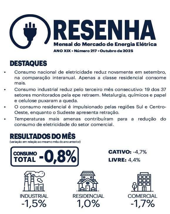 No mesmo recorte de análise, o consumo residencial este ano foi de 14.355 GWh e, no mesmo período de 2024, de 14.209, com variação de +1,0%. Na classe industrial, o consumo em setembro desse ano foi de 16.665 GWh e, em 2024, de 16.919 GWh, uma queda de -1,5%.