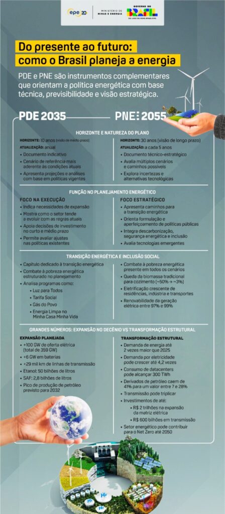 O infográfico do Ministério de Minas e Energia/Empresa de Pesquisa Energética traz mais informações sobre o PDE 20235 e o PNE 2055. Veja abaixo: