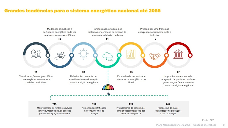 O material produzido como parte da construção do plano considera análises que priorizaram os pontos de vista técnico-econômico e socioambiental, quando aplicado, para avaliar a disponibilidade de fontes energéticas no País ao longo do horizonte de planejamento até 2055.