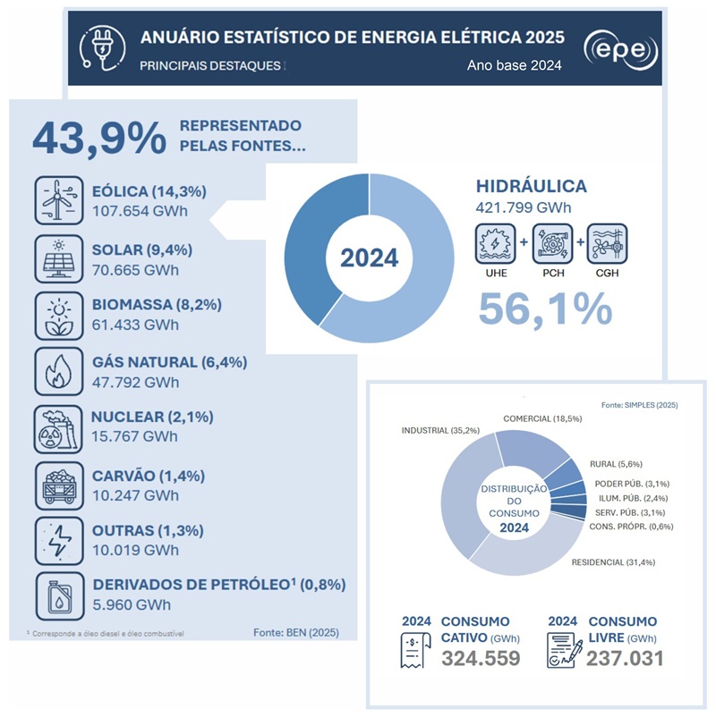 O Anuário aponta que em 2024, o consumo de energia elétrica no Brasil foi de 561,6 TWh, com crescimento de 5,6% frente a 2023.